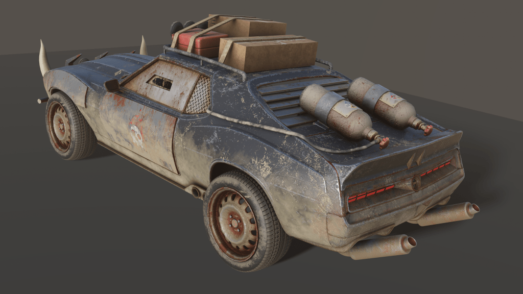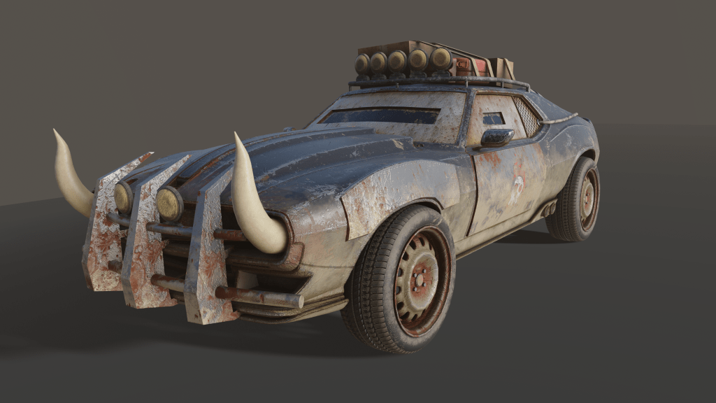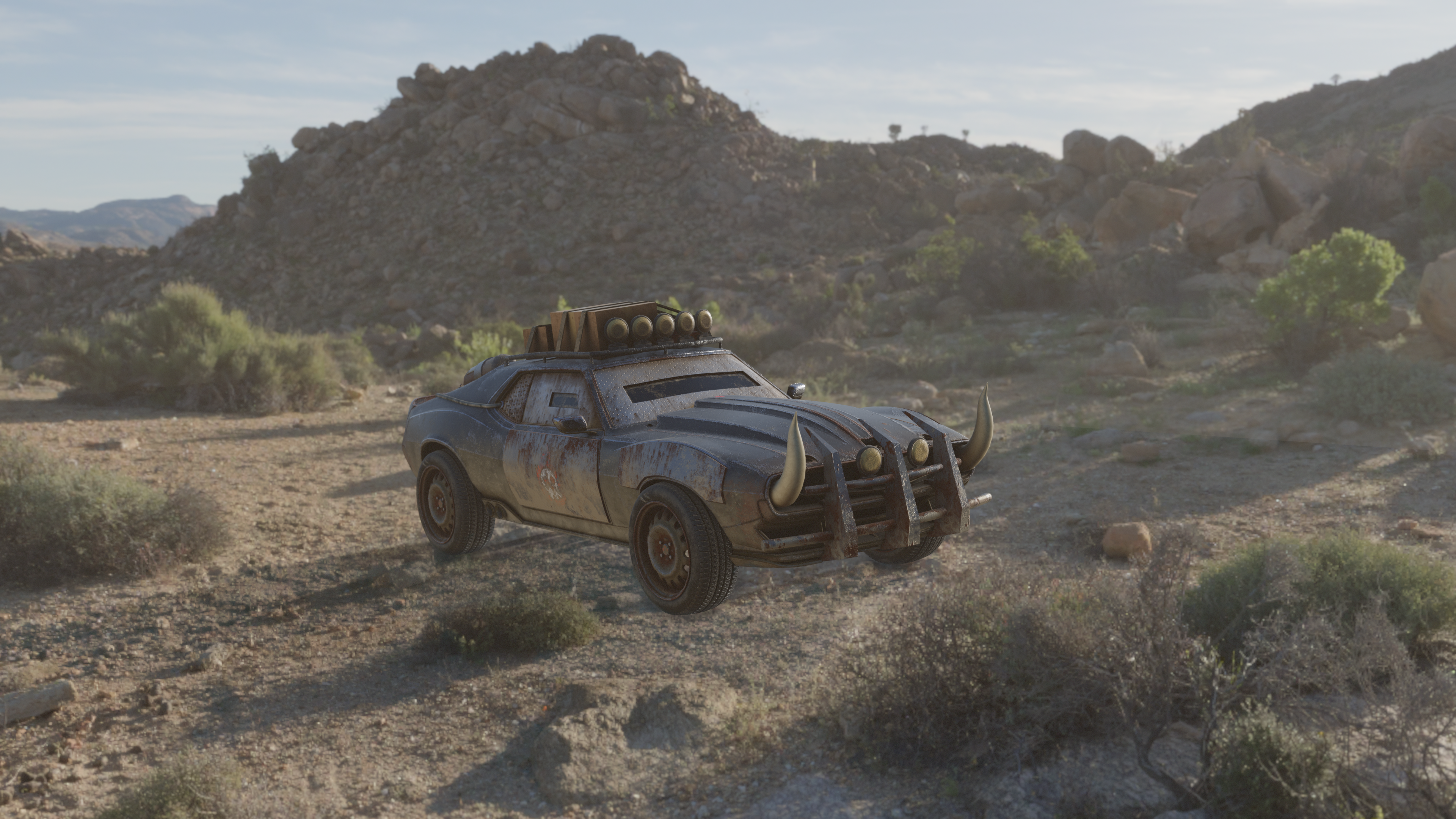 The premise of the project was to use parts from files provided by the professor, to create a car from mad max (or at least from a post apocalyptic theme.) I had inspirations from different concepts, while improvising to make a car that was intended for speed. The car body, wheels, exhaust, flood lights, and nitro tanks were kit bashed while the rest was modeled by hand. It took a lot of retopology to get it correct, and eventually moved to texturing, then finally rendering in Marmoset, by using a shadow catcher and an HDRI.