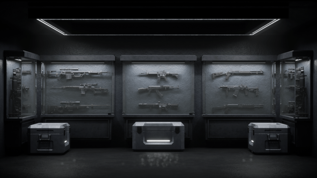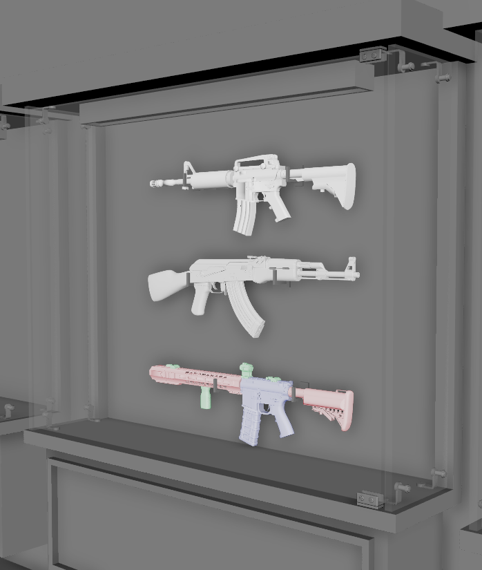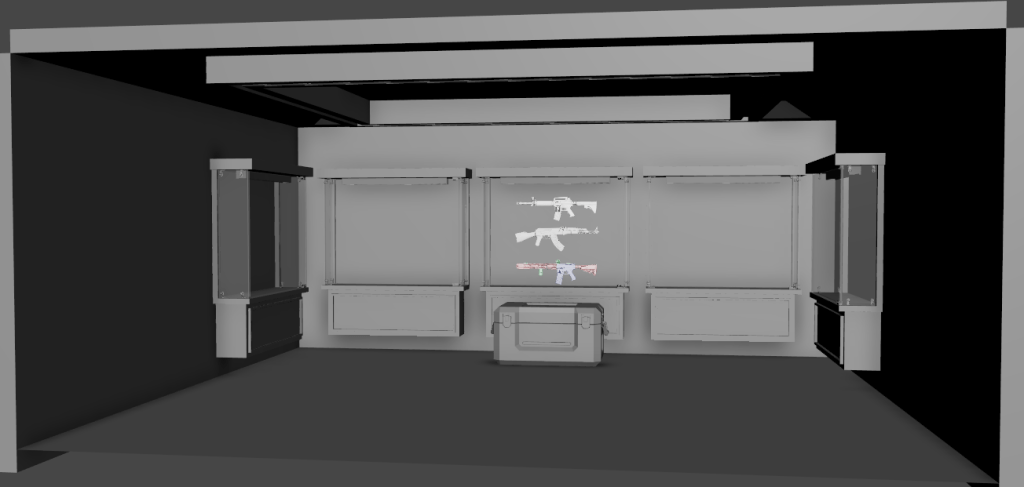 I was assigned to model a gun room scene and implement the Cases that I modeled in a previous assignment. But since there was a budget on time for the assignment. I was instructed to gather gun models that the game has specified, although I wasn’t provided the gun models I made sure to gather gun models from sketchfab and did thorough research to gather guns that had the proper commercial license for free use, given that I give proper credit to the person that made them and textured them.